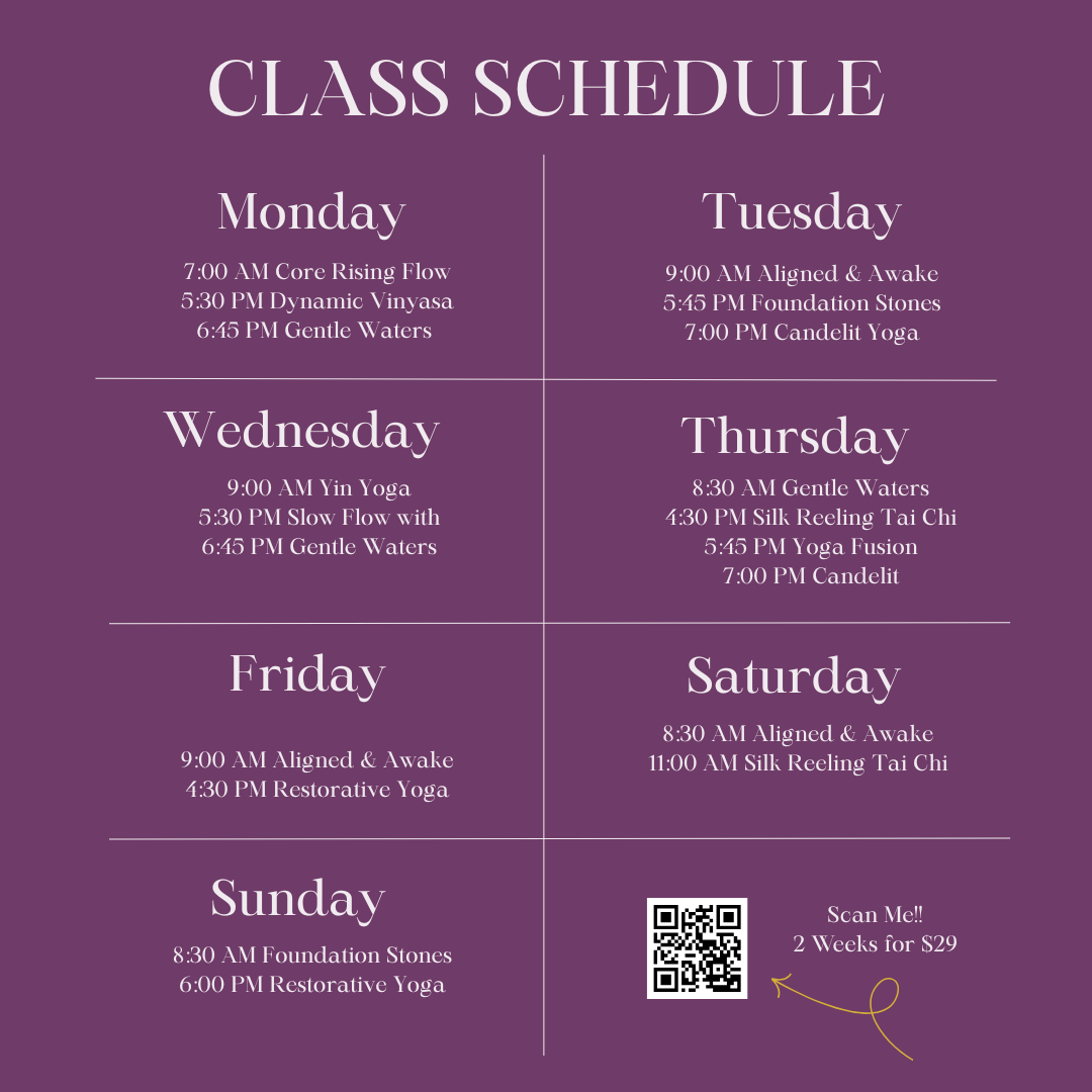 A slow-paced, supportive class that breaks down the essentials of yoga—postures, breath, alignment, and awareness—while honoring your individual needs. Expect clear instruction, hands-on options (if welcomed), and a space where questions and rest are always encouraged. Foundation Stones is ideal for beginners or anyone looking to reconnect with the basics in a grounding, judgment-free environment.
